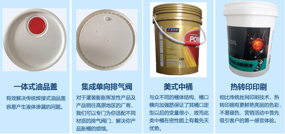 我們?yōu)榭蛻籼峁┡蛎浶砸后w的排氣解決方案,解決液體肥料膨脹問題以及油品運(yùn)往高海拔地區(qū)時(shí)的桶內(nèi)壓力變化問題;提供塑料制提手,握感更為舒適且承重能力大幅提高;一體式包圍油品蓋,解決傳統(tǒng)焊接小蓋滲漏問題;配套為客戶提供桶身絲網(wǎng)印刷及更為高檔的熱轉(zhuǎn)印印刷方案。