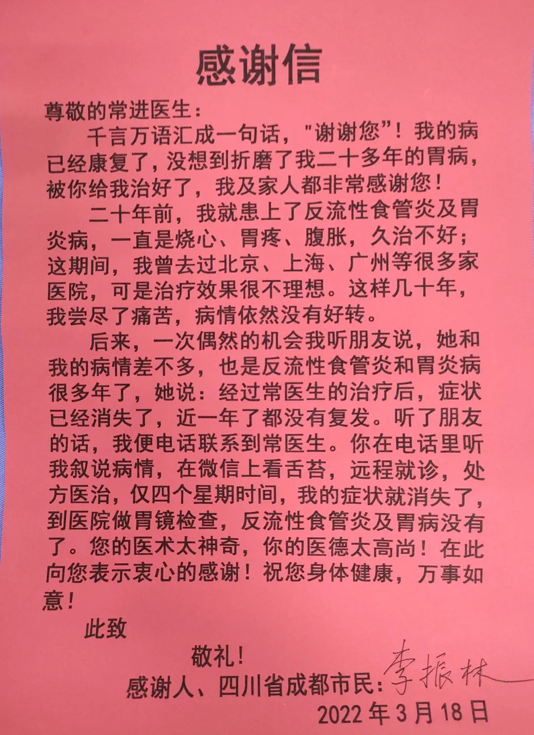患者李振林先生飽受反流性食管炎及胃炎病二十余年的困擾,曾去過多地尋醫(yī)問診,但療效一直很不理想,經(jīng)朋友推薦聯(lián)系到常主任,經(jīng)遠程就診用藥,僅用了四個星期病癥完全消失且再無復發(fā)。李先生非常感激,特意訂制了“醫(yī)術精湛手到病除 醫(yī)德高尚名揚天下”的錦旗,向常主任表達了衷心的感謝。